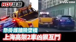 上海高架2車凶狠互鬥 懸掛護牆險墜橋